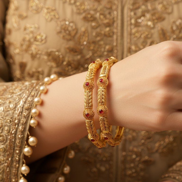 Rediscover the charm of tradition with this six-piece set from Mawla. Featuring intricate gold texturing highlighted by vibrant red accents, these bangles are designed to complement your ethnic wardrobe perfectly. Whether for a wedding or a festive gathering, this durable and stylish collection brings you the luxury of premium artificial jewellery at an incredible value.