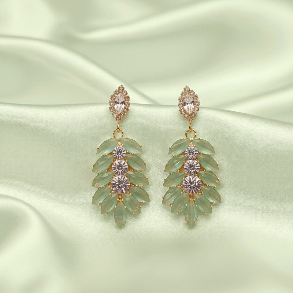 Add a breath of fresh air to your jewelry collection with our Mint Green Crystal Leaf Statement Earrings. These stunning drops feature a lush arrangement of marquise-cut mint green crystals, layered to create a delicate leaf-like silhouette. Infused with a row of sparkling clear round crystals and finished with a shimmering pavé stud, these earrings offer a vibrant yet sophisticated pop of color. Perfect for the modern romantic, they bring a touch of nature-inspired luxury to your favorite ensemble.