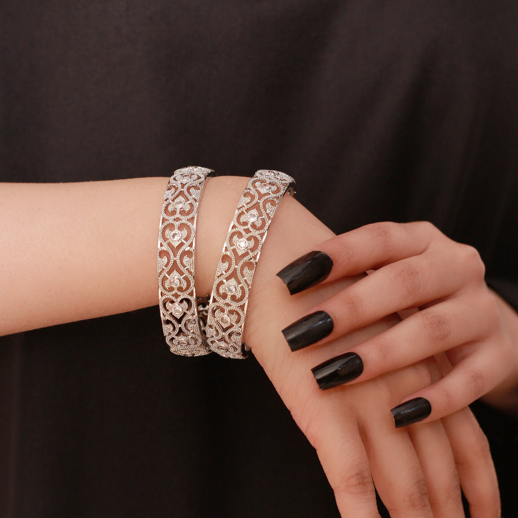 Redefine traditional elegance with this stunning pair of Silver Filigree Kada Bangles from Mawla Jewellers. These bangles feature an intricate, open-work heart and swirl motif, meticulously crafted to create a lace-like effect on the wrist. Each delicate curve is accented with shimmering round-cut zircon stones, providing a sophisticated sparkle that mimics the brilliance of diamonds. Designed for the modern woman who appreciates heritage craftsmanship, these Kadas are the perfect statement piece for weddings, formal parties, or evening galas.